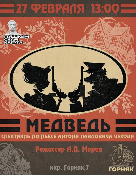 Друзья, приглашаем вас на спектакль «Медведь» в одном действии по произведению Антона Павловича Чехова.